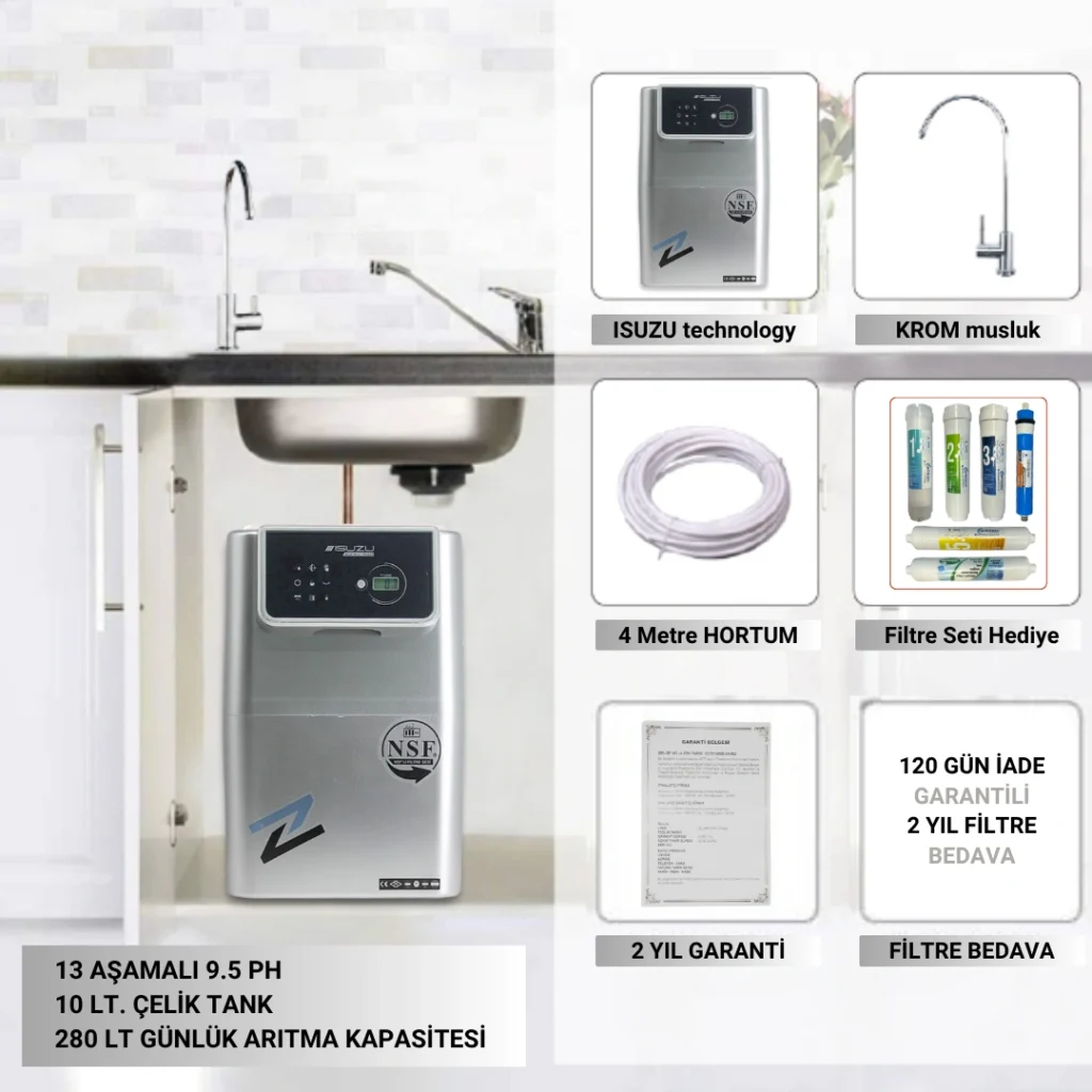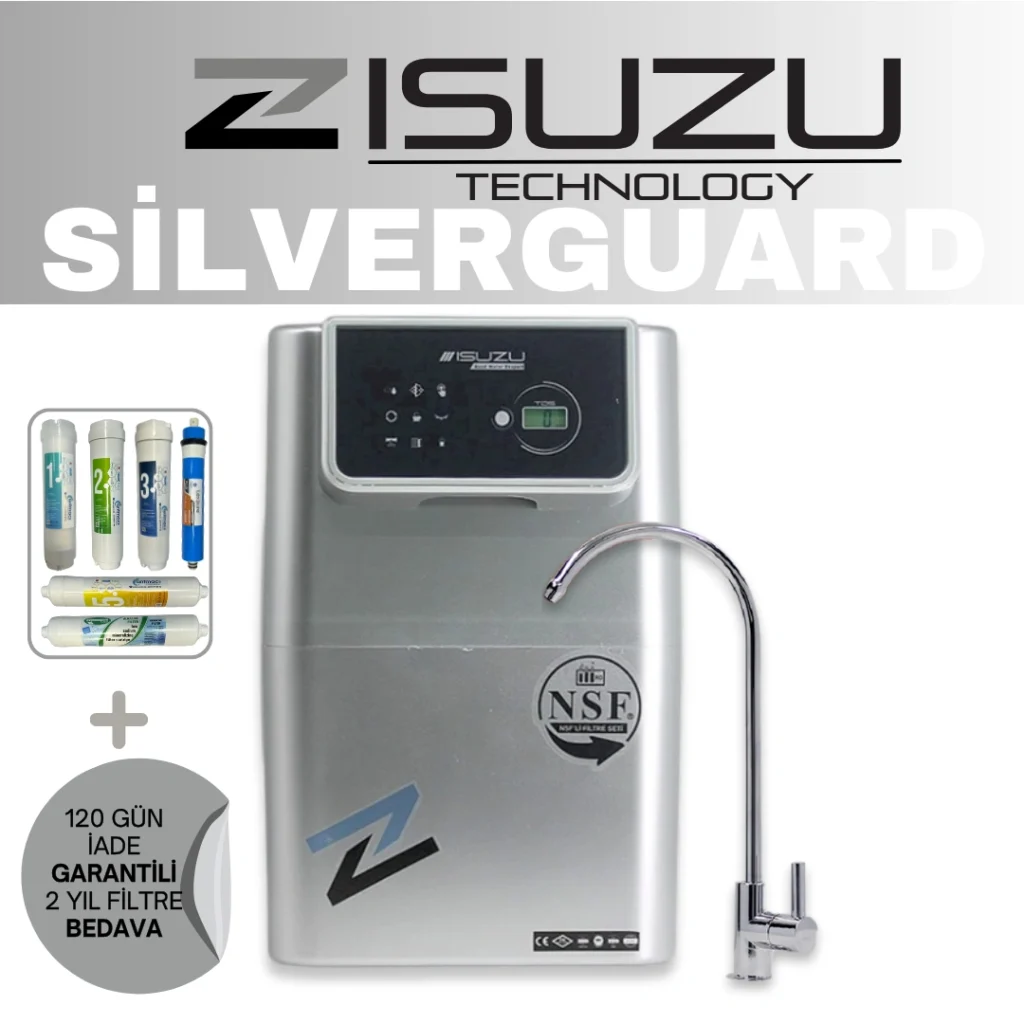 Isuzu SilverGuard su arıtma cihazı, en son nesil filtreleme sistemleri sayesinde musluk suyunu zararlı maddelerden arındırırken doğal mineral dengesini korur. Şık tasarımı ve yüksek performansıyla evinizde hem estetik hem de güvenli bir çözüm sunar. Günlük yaşamınızda daha temiz, daha sağlıklı ve daha lezzetli suya ulaşmanın en pratik yolu SilverGuard ile artık mümkün.